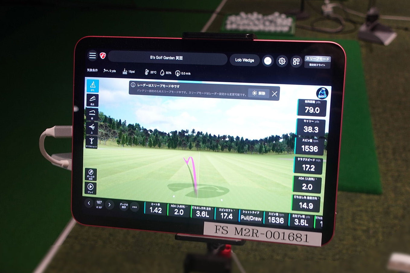 「フライトスコープのFSゴルフアプリを一番活用しています。弾道が大きくスクリーンに映し出されることによって、ショットのイメージが沸きます。さらに、ボールスピードや、スピン量、飛距離だけにとどまらず、AOA(入射角)が崩れている人も多いので、そのあたりも含めていろんなデータをレッスンに活用できています。ほかにも、お客様のスマホをビデオのマルチカム機能で接続して、お客様のスイングデータをお客様のスマホで確認できたり、お客様のスマホをリスナーモードで接続して、どちらでも見れるなど、多彩な機能を試しながら使用しています。」(岩本さん)